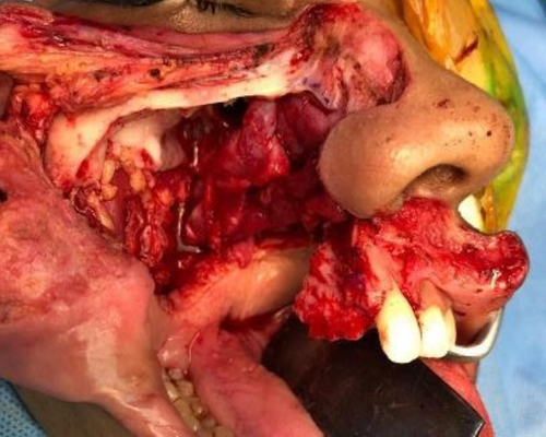 This time, the tumor was destroying the entire right side upper jaw bone and projecting inside the nose of the patient.